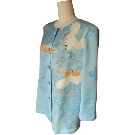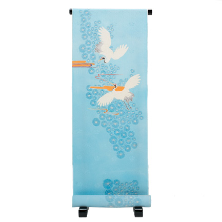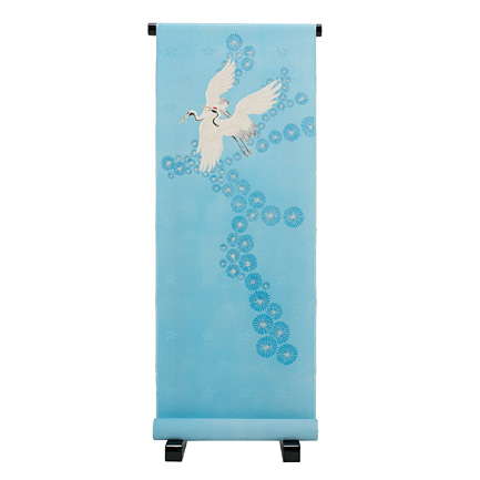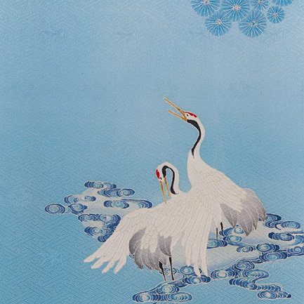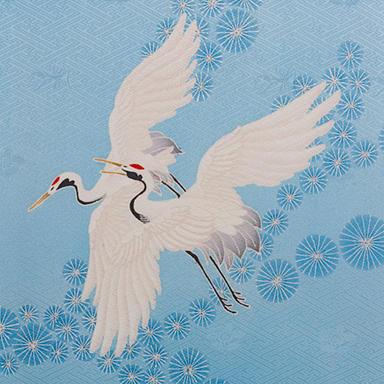 鶴と松を組み合わせて吉祥文様にし、地色は依頼者の希望でもあり、ストーリーとしてイメージした空からご主人さまが見守っているような空色でお客さまを包み込むように染めました。