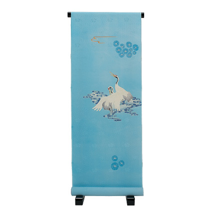 羽の部分は白の胡粉ぼかしで、一組のつがいだけ桜色のぼかしで変化をつけています。雲の黄色は思い出が黄金に輝くよう、また反射した光が鶴を照らすように金黄色で色挿ししました。