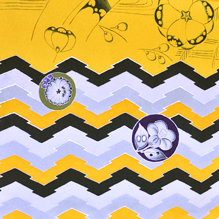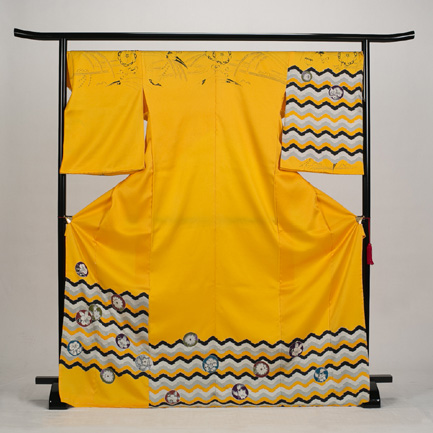鬱色(うこんいろ)で染めたく、その色を活かす配色にしました。黄色に赤味を加え、チベット僧侶の袈裟のようでもあり中国の皇帝服に用いられた黄色でもあり私の中では高貴な色と受け止めています。