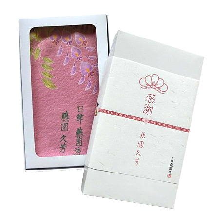 『藤園流』の踊りの発表会で顔を隠す踊りで使いたい、その後は記念にとっておけるように、という主旨で生地は正絹、柄は藤、地色は赤味を含んだ柔らかい藤色、そのご意向をふまえて画から描き、ご依頼を受けて制作した記念の作品。20枚納品させて頂きました。 |